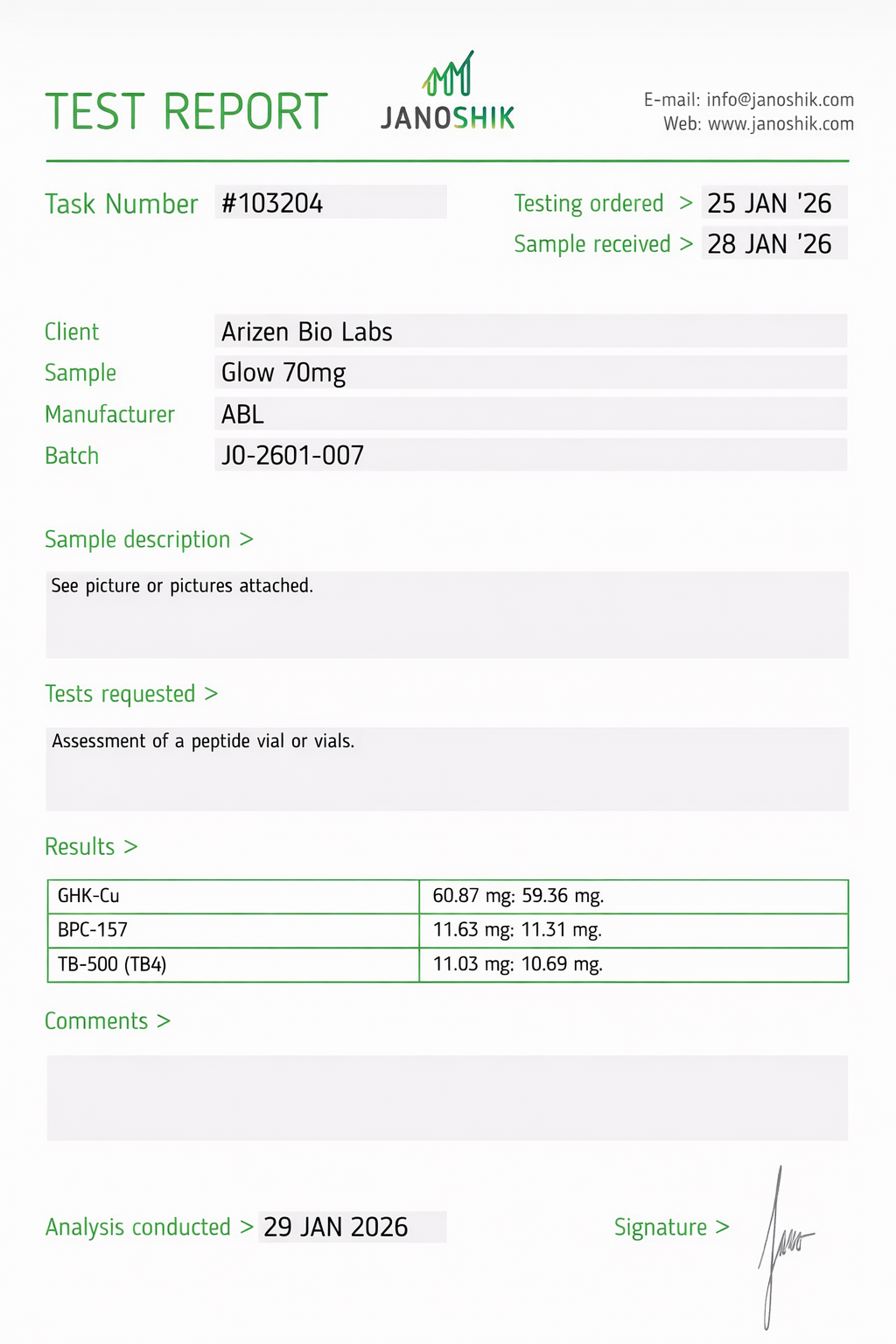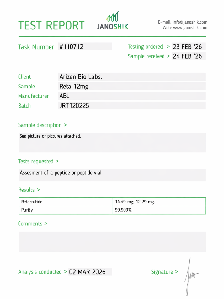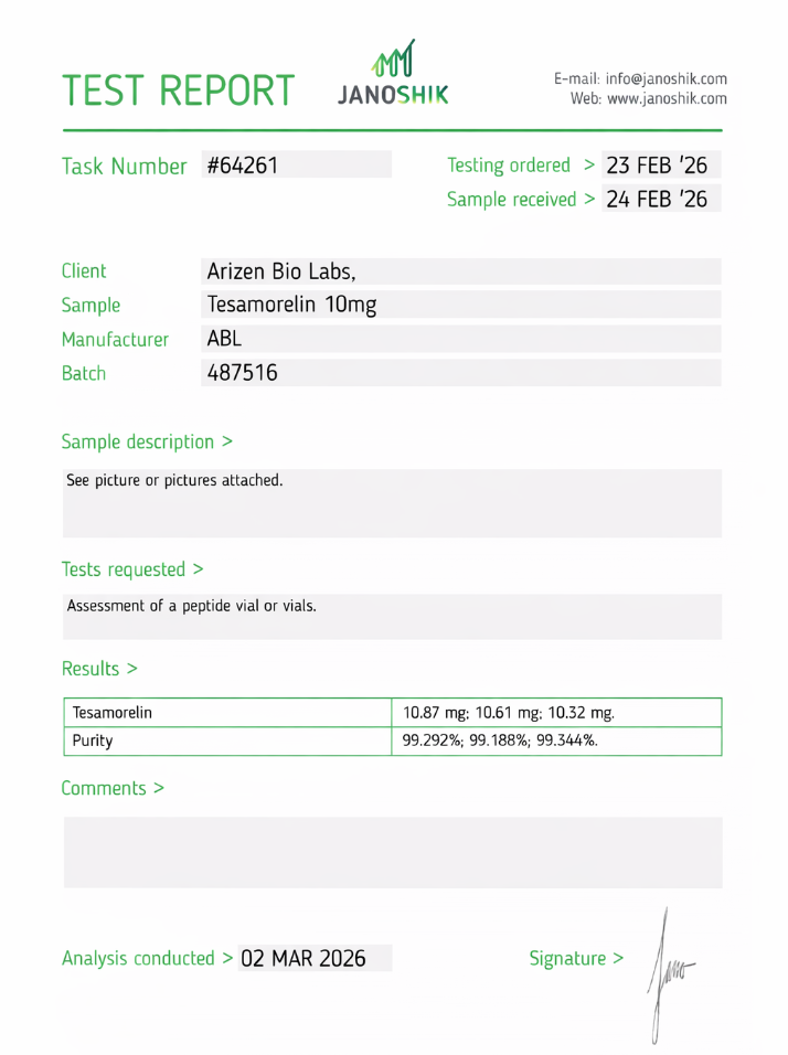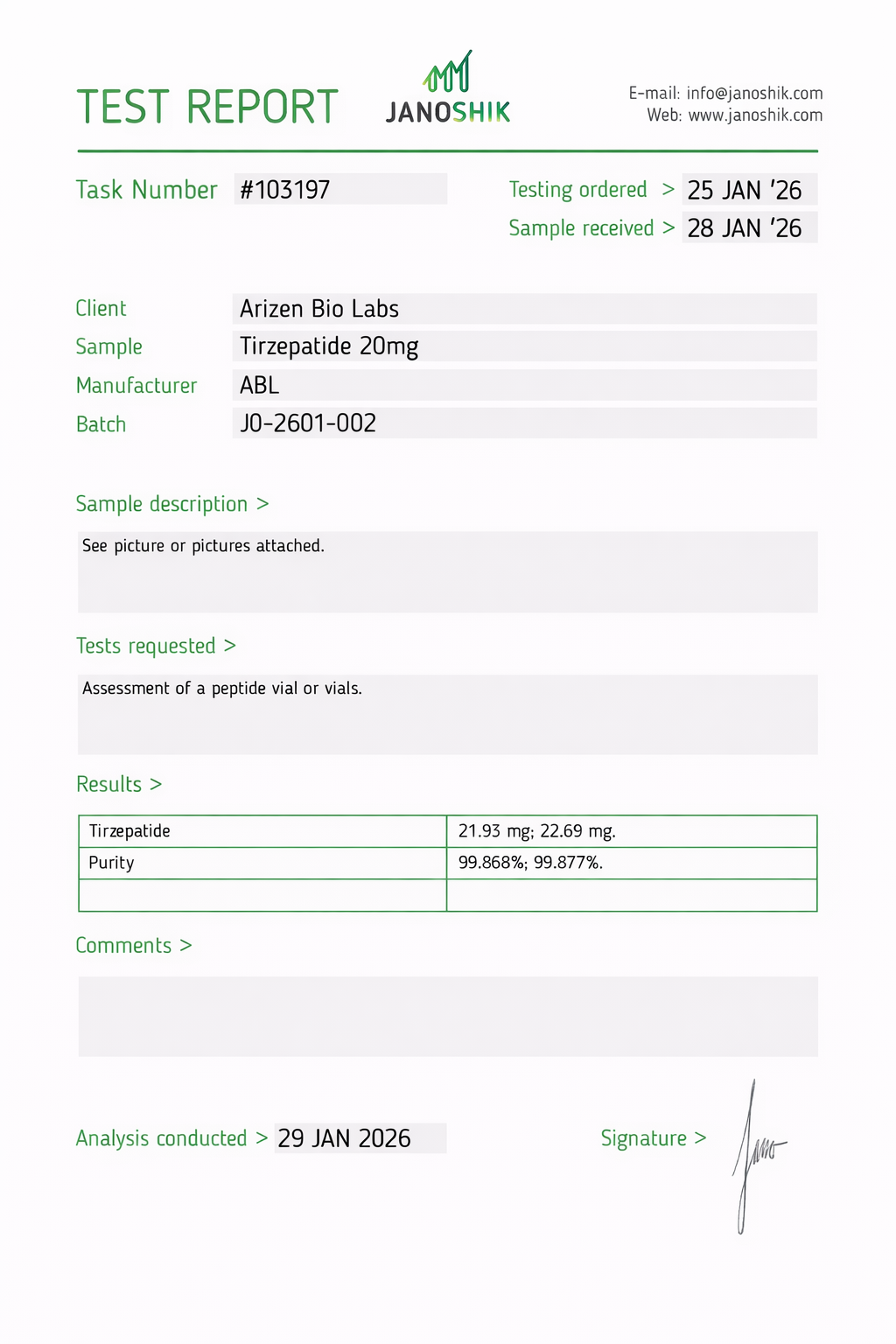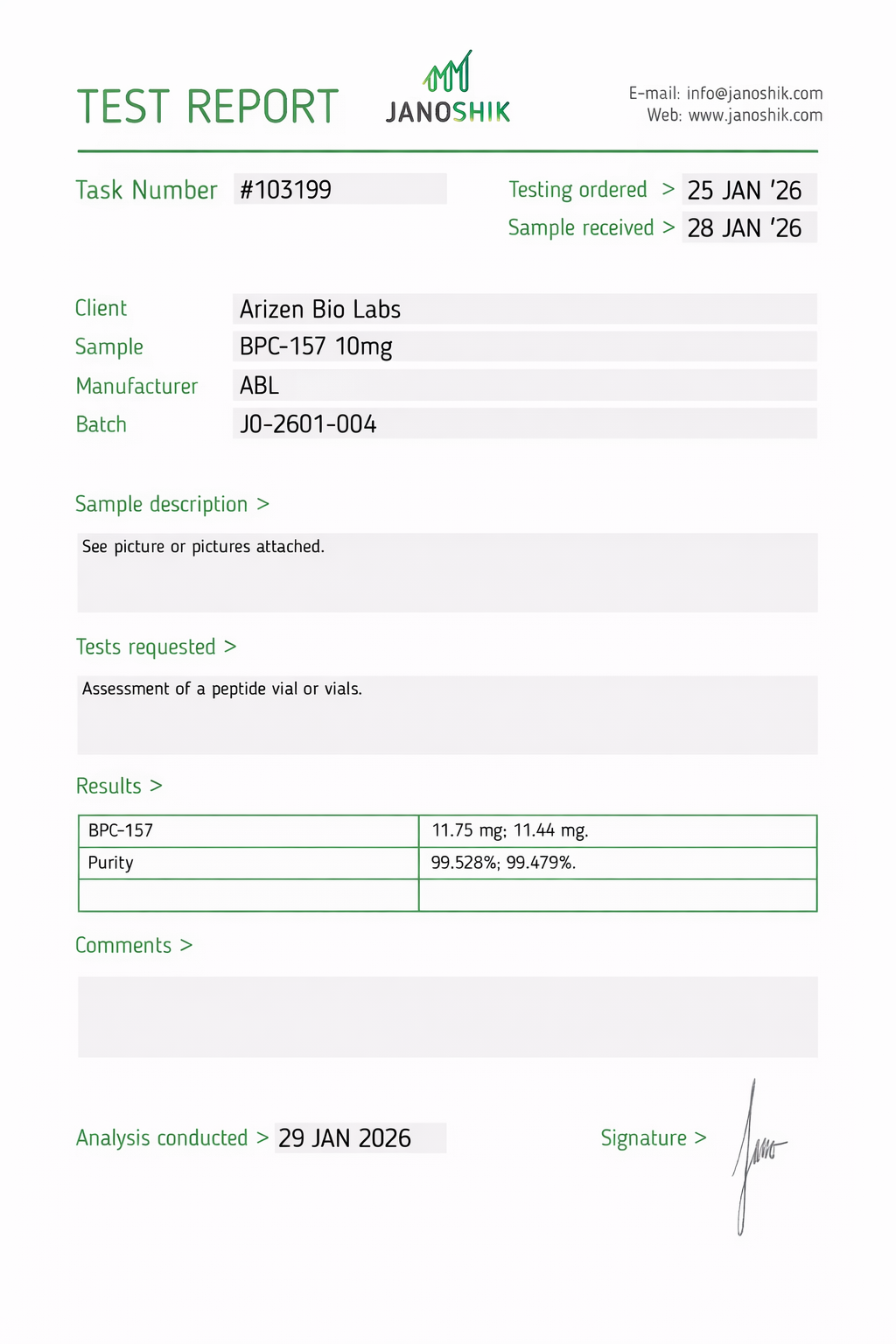 Every batch of Arizen BioLabs compounds is independently tested by third-party laboratories to ensure 99%+ purity and accurate identification.