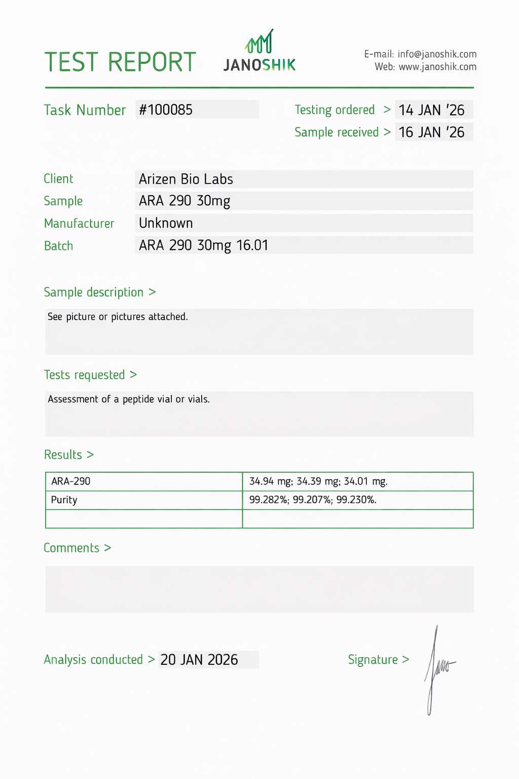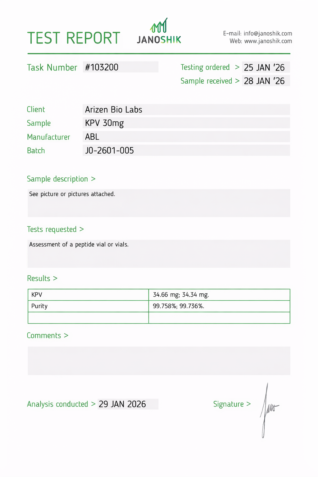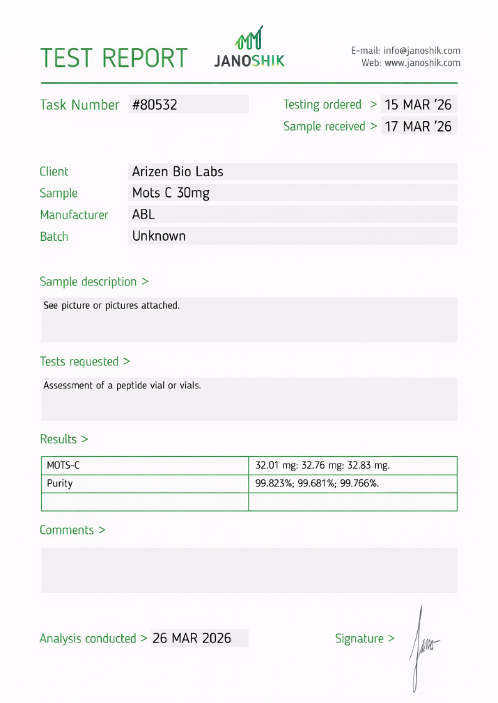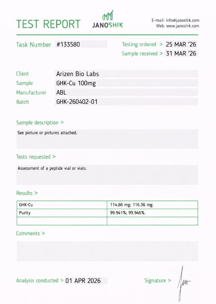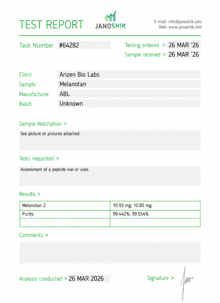 Every batch of Arizen BioLabs compounds is independently tested by third-party laboratories to ensure 99%+ purity and accurate identification.